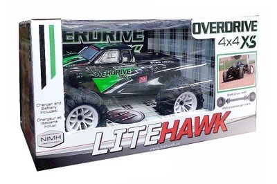 Take on multiple terrains, grass, gravel, pavement and perform jumps with the new OVERDRIVE 4 X 4 SX. Incredible high torque twin motors working simultaneously can accelerate this 4WD monster truck to speeds of 40km/h. 2.4GHz control allows the ability to race without worrying about frequency interference. This truck is a smaller backpack size version of the LiteHawk Overdrive. Go where the original version was too large to go. • Shaft driven 4WD is durable, fast and responsive with next level off- road performance. • Working LED lights • Features soft all-terrain rubber tires for superior grip and performance. • Independent front and rear suspension, universal drive shaft • Aluminum and composite shocks, steel ball bearings and aluminum motor heat sink • Powerful motor can power vehicle to speeds up to 25mph (40km/hr).