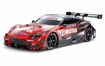 The Motul Autech Z is raced by the NISMO team in the 2023 Super GT series. Although it inherits elements of the NISSAN Z road car design, it is very different, with a carbon fiber body and a front 550hp-plus 2-liter 4-cylinder single turbo engine. It got off to a great start, winning the opening race of 2023 in Okayama. The authentic form of the Motul Autech Z is captured in style by a lightweight, rigid polycarbonate body with separate polycarbonate front and rear light cases (LEDs are not attachable) and canards. Separate black ABS plastic parts realistically depict distinctive side mirrors and a large rear wing. The model uses the shaft-driven 4WD TT-02 chassis which features superior adaptability and stability. 6-spoke black wheels are paired with slick tires. Includes Item 51007 (Urethane Bumper M (TT-01/TGS)) to keep the body in top condition. Comes with stickers and masking stickers for use in the paint job. Length: 468mm, width: 188mm, height: 120mm. Wheelbase: 257mm.